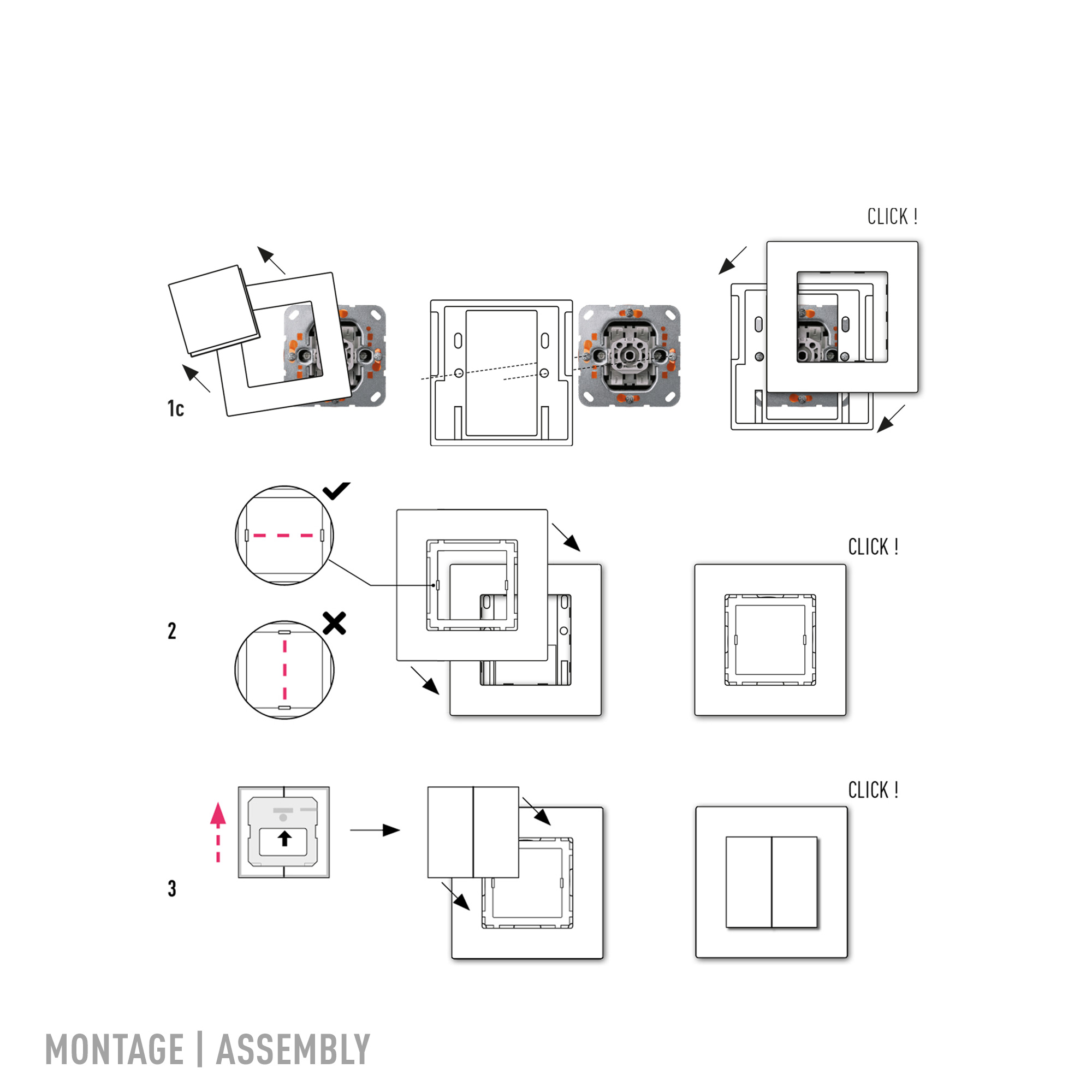 | Cover frame: | Material: plastic, alpine white glossy (RAL9010), Mounting: screwed onto flush-mounted box, Over mounting: to cover existing switch insert |